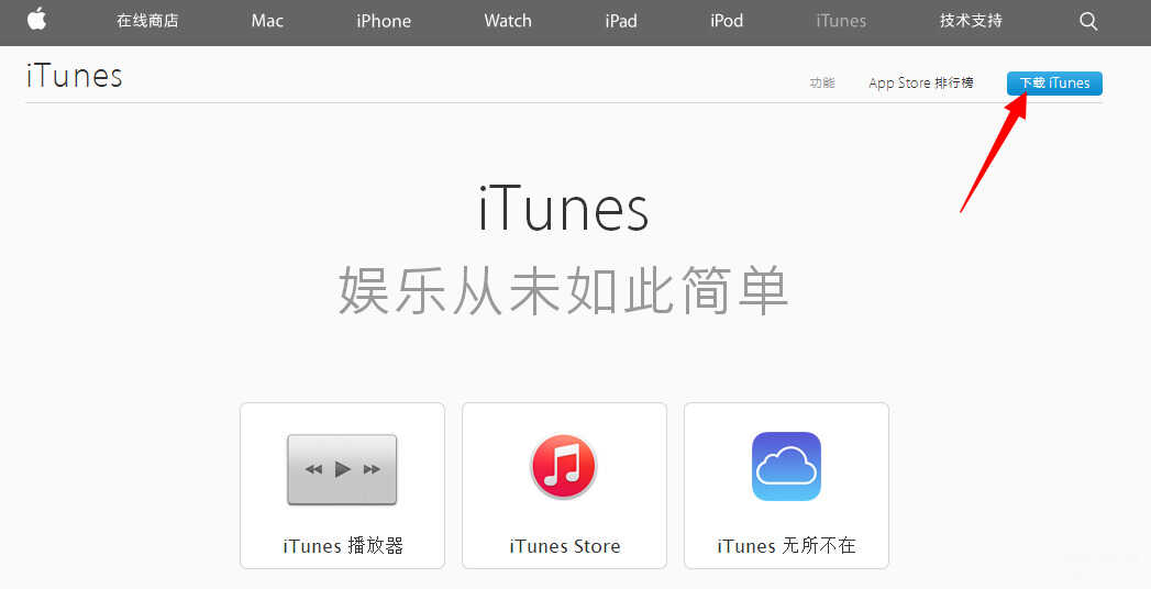 进入到iTunes的介绍页面,在右上角可以看到下载iTunes的蓝色按钮,点击打开