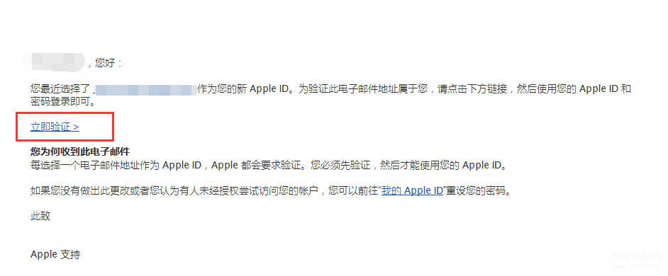 这时,系统会发送一封验证邮件到所注册的Apple ID邮箱当中,点击好