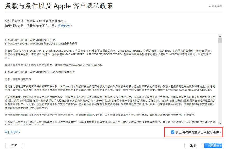 在打开的条款与条件以及Apple客户隐私政策页面中,勾选同意以上条款与条件,然后点击同意