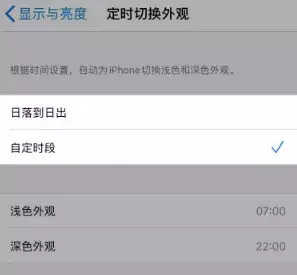 也可以开启「自动」选项,选择「日出到日落」或「自定时段」切换浅色或深色外观。