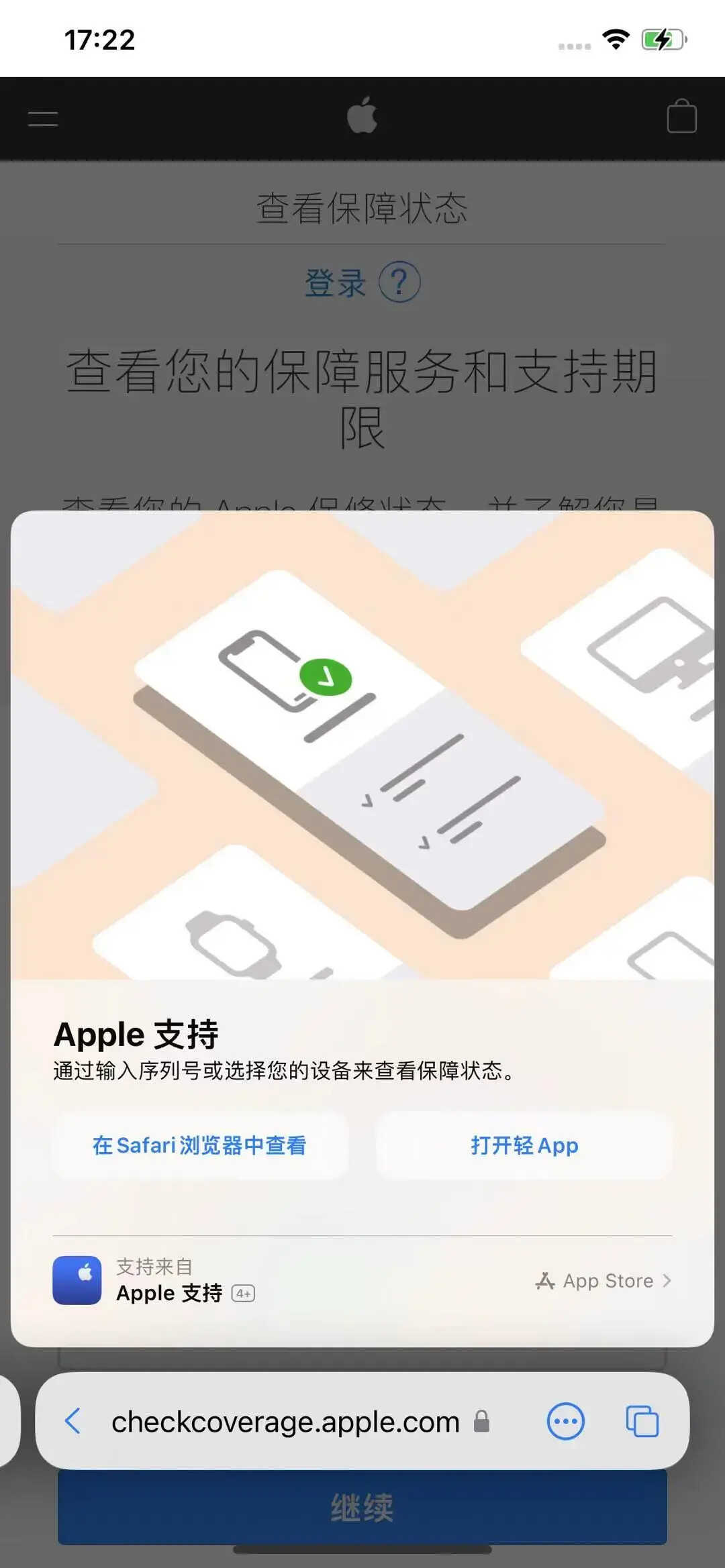 之前想体验的同学,只能前往 App Store 免费下载和获取,而现在“Apple 支持”现已推出轻 App(App Clips),不用输入序列号和验证码即可方便地查询到保修期限。