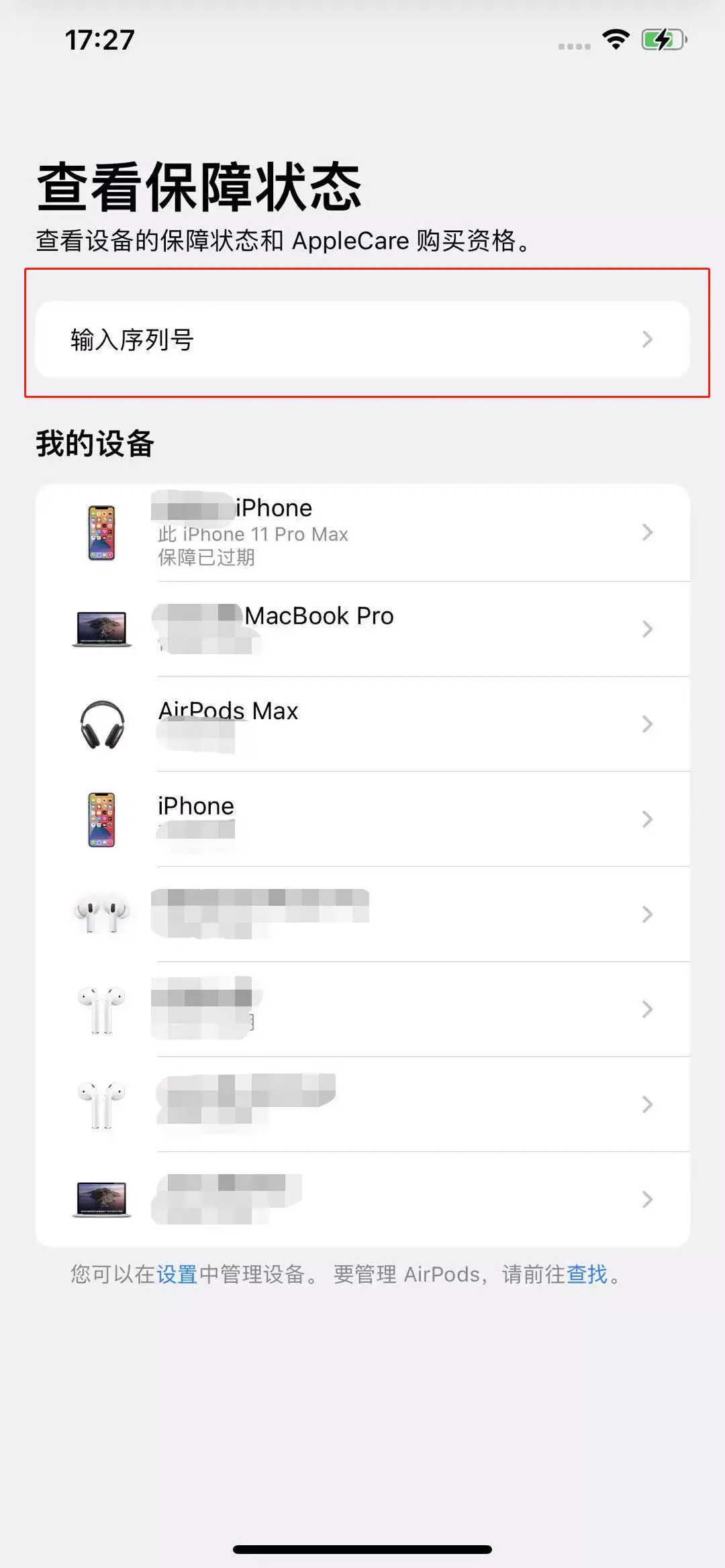 当然,有些设备可能没有登录同一个 Apple ID,那么这时候想要查询的话,直接点击顶部的“输入序列号”就可以查询信息了。