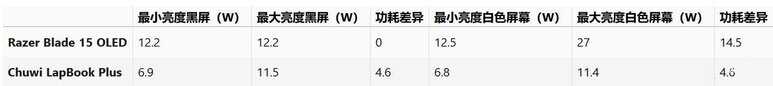 Blade OLED比Chuwi IPS在各自最高亮度下(470 VS 360尼特),显示纯黑内容仅相差0.7W的功耗。