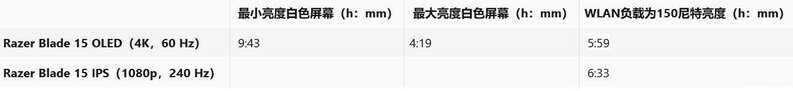- 最高亮度Blade OLED只有4小时19分,合计:259分钟续航。