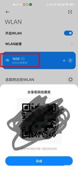 步骤3、点击已经连接上的自己家的WIFI名称,点击分享密码,它会弹出来二维码;