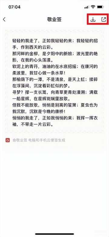 4、点击【以图片形式分享】按钮之后,可以看到文字生成的图片预览,点击右上角的保存和分享按钮,即可保存到本地或分享至社交平台。