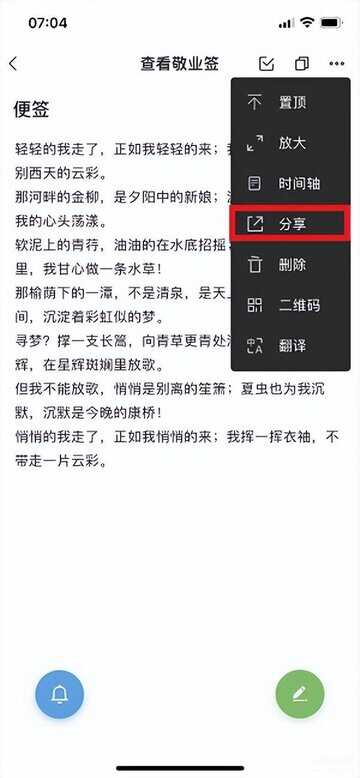 2、点击内容进入查看敬业签界面之后,找到界面右上角的三个点按钮,点击三个点按钮之后,在下拉菜单中找到【分享】按钮,轻触点击一下。