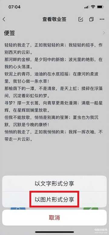3、点击分享按钮之后,会从屏幕底部弹出两个选项,分别是【以文字形式分享】和【以图片形式分享】,点击选择以图片形式分享这个选项。