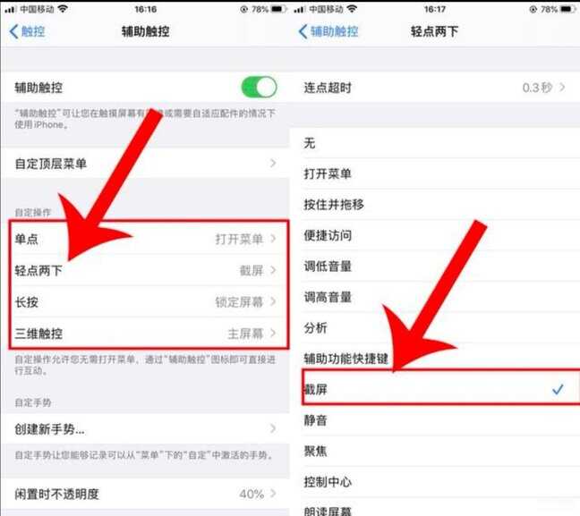 设置→辅助功能→触控→自定操作→然后就可以根据自己的使用习惯,可以设置单点、轻点两下以及长按截图三种操作做为截图方法。