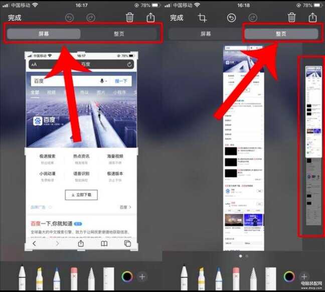 接着打开手机中的safari浏览器,然后随便打开一个网页,接着通过上诉的两个方法进行截图,截图成功了就点击左下角的缩略图,接着就会出现两个选项:屏幕或者整页,选择整页就可以实现截长屏啦。