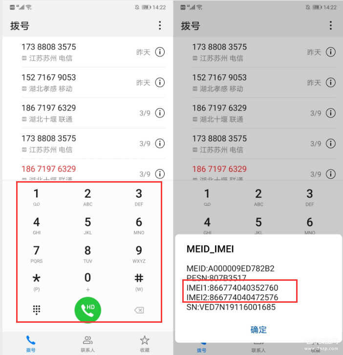 打开手机的拨号界面,输入*#06#就可以自动弹出IMEI码,千万别小看这串码哦,我们后面会用到。