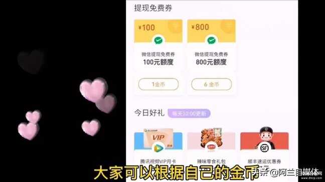 我领到了一个金币,然后点下方的“兑换好礼”,在下方有很多的好礼,大家可以根据自己的金币情况来进行领取,注意看上方有提现免费券,我们需要提现免费的话,就需要兑换提现免费券。那现在我有一个金币,这里有两个额度,一个是100元的额度,一个是800元的额度!