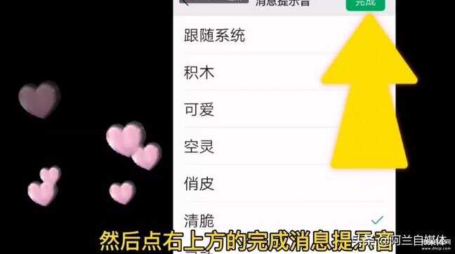 我们先把“消息提示音”打开,如果你不进行设置,提示音是跟随系统的,下面有很多种提示音,我们可以来试听一下,喜欢哪个就用哪个。比如说我喜欢这个“清脆”的声音,那我就选择这个“清脆”的,后面打一个对勾,然后点右上方的“完成”,消息提示音设置好了之后,当别人给我们发新消息的时候,他的消息提示音就成了我们喜欢的声音啦,这是很不错的!