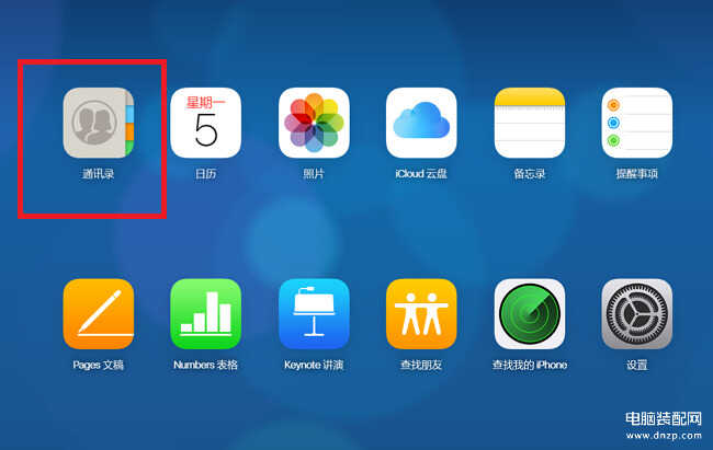 1. 首先我们先从电脑上通过登录自己的AppleID进入到网页版的iCloud页面中来,然后,从页面中选择【通讯录】的选项;