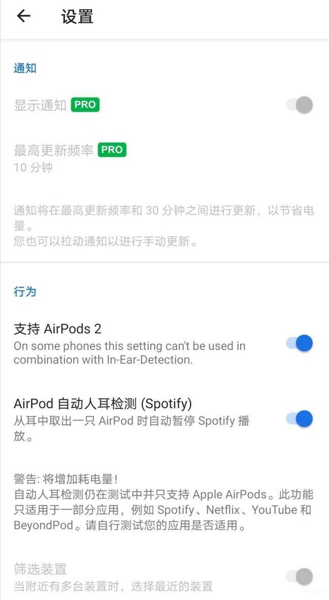 不过会有人问,iPhone与AirPods配对后可以实现摘下耳机自动暂停播放还有敲击耳机可以实现切歌和暂停的功能,那下载的这个APP有这些功能吗?小黑要告诉大家的是,必须有!而且这些功能均为免费设置使用,不用额外升级成Pro版。