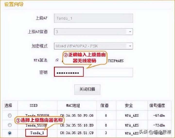 登录到腾达无线信号扩展器设置页面后,会自动扫描附近的WiFi信号,在扫描结果中,选择需要被扩展的WiFi信号即可。如下图:
