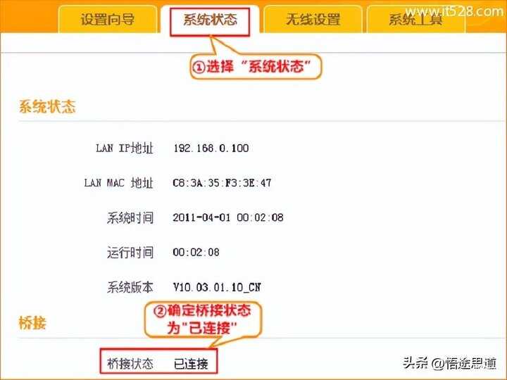 点击“系统状态”,查看桥接状态是否显示“已连接”(桥接后A301无线名称与上级路由器无线名称相同)。如下图: