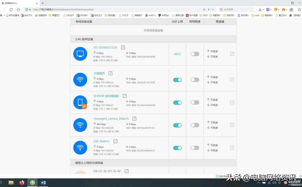 (不同的路由器面页可能不同)在路由器后台的面页可以设置每台网络设备手机,电脑的的访问限速,禁止联网,显示隐藏WIFI信号等操作,如果看到自己不知道的设备可以禁止联网,这样就可以解决上网卡慢的途径之一了,还有就是路由器一天24小时都在不间断工作,设备硬件芯片发热量大,影响了网速问题,一般我们可以将路由器断电5分钟左右重启路由器。重启路由器可以解决一部分路由上网卡慢,路由系统后台面页登录失败等问题,如果还不能解决可以RESET恢复出厂设置重置路由器重新设置上网参数.