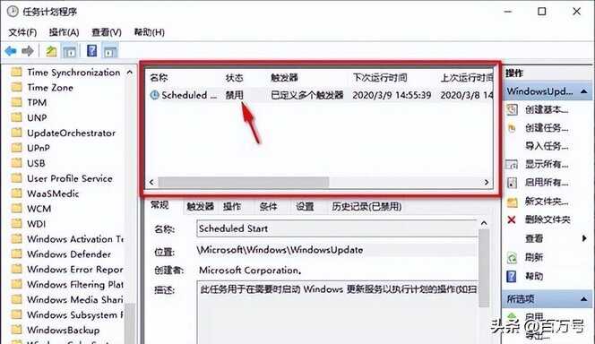 2、在任务计划程序的设置界面,依次展开 任务计划程序库 -》 Microsoft -》 Windows -》 WindowsUpdate,把里面的项目都设置为 [ 禁用 ] 就可以了。(我这里边只有一个任务,你的电脑里可能会有2个或者更多,全部禁用就行了)