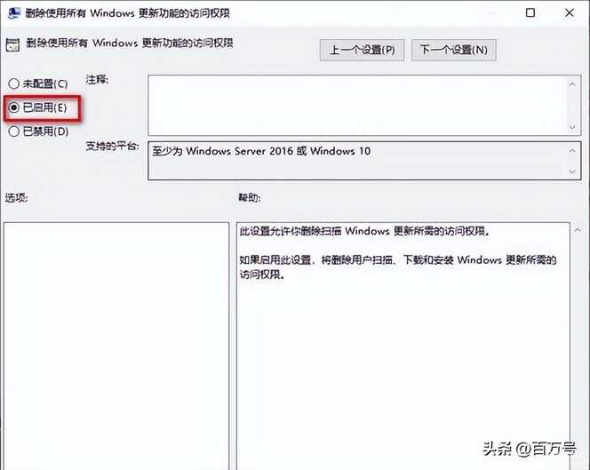 4、之后还需要再找到“删除使用所有Windows更新功能的访问权限”,选择已启用,完成设置后,点击“应用”“确定”,如图所示。