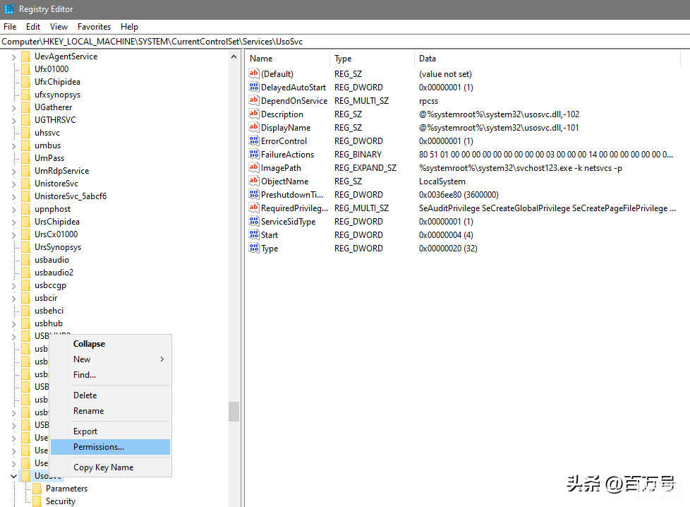 2、在注册表设置中,找到并定位到 [HKEY_LOCAL_MACHINE\SYSTEM\CurrentControlSet\Services\UsoSvc] (包括HKEY_LOCAL_MACHINE\SYSTEM\CurrentControlSet\Services\WaaSMedicSvc,操作完全一致)。然后在右侧找到“Start”键。