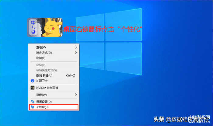 第1步:先在电脑的桌面空白处(即无任何文件处)右键一下鼠标,然后点击“个性化”;