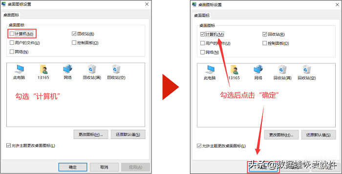 第3步:这里能看到一个“计算机”,这就是我的电脑啦!但是它的小方格是空的,也就是未勾选状态,我们给它点击一下打上勾后就可以“确定”啦!