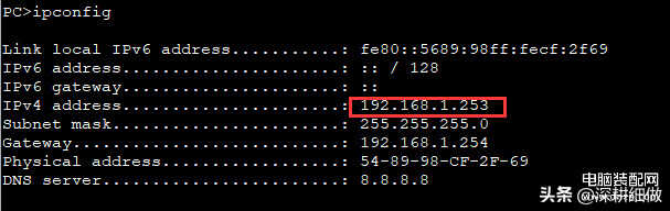 在命令行输入ipconfig,可以看到PC1已经获取了一个IP地址