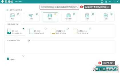在官方网站上下载好软件,之后打开界面,选择你要恢复的文件类型(可以直接单选文档,也可以选择全部勾选)和文件所在的位置,直接选择“扫描”。