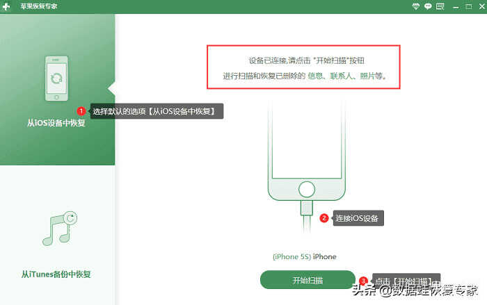 第一步:在电脑上下载并且安装好数据蛙苹果恢复专家这个软件,根据下图的提示进行操作。