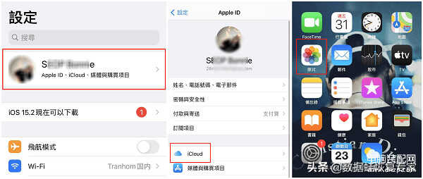 为了确保iCloud是否开启,我们先去到设置那里,点击Apple ID,再查看iCloud里的相册是否打开,确认是开启状态后,返回到主界面,点击相册就可以查看了,这是最为直接的途径。