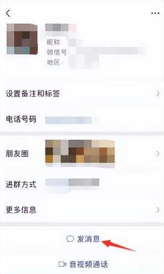 1. 打开手机中的【微信】App,先找到相关好友,接着根据下图箭头所指,点击【发消息】选项。