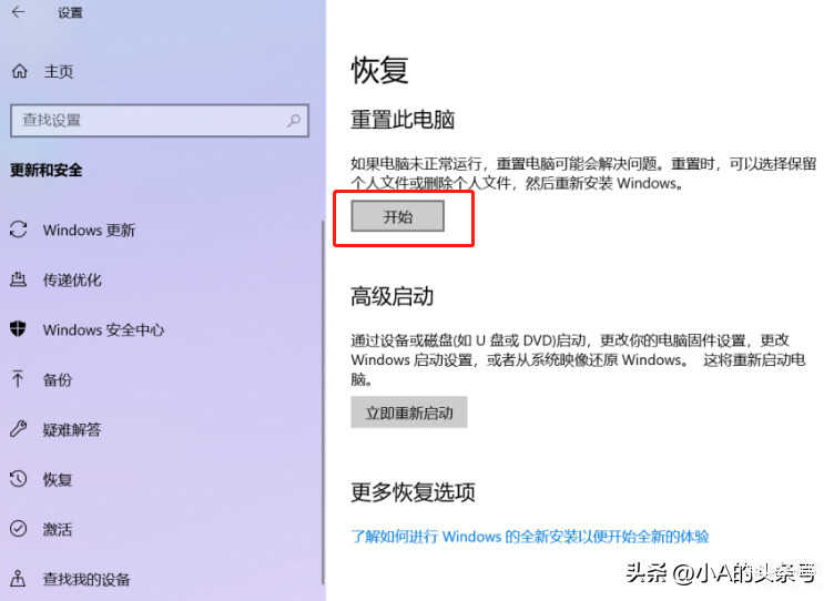 恢复出厂设置也可以解决Wifi网络问题,设置中找到“恢复”选择“重置此电脑”即可。不过在重启之前小A提醒大家,最好提前备份电脑中的资料,避免重置之后重要资料丢失造成麻烦。