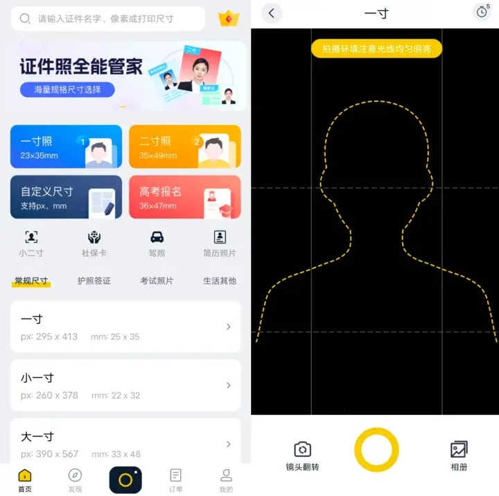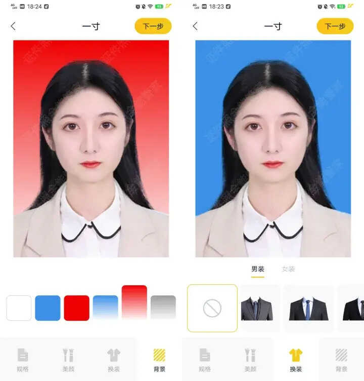 选择首页的照片尺寸→拍照或者上传照片→底部选择背景→更换需要的底色→保存成品图
