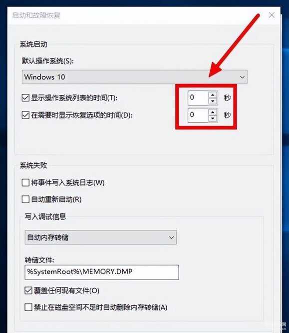 5、把“显示操作系统列表的时间”和“在需要时显示恢复选项的时间”都改为“0”秒。如图所示: