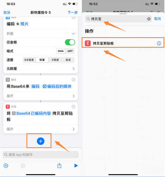 返回后,继续点击「+」按钮。接着在搜索框中输入「拷贝至」,选择搜索结果中的「拷贝至剪切板」,并点击「下一步」。