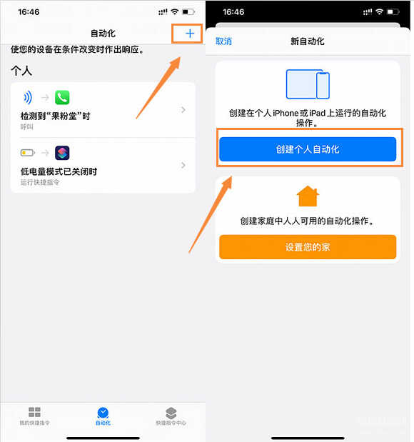 然后在快捷指令 APP 中的「自动化」页面,点击右上角的「+」,选择「创建个人自动化」。