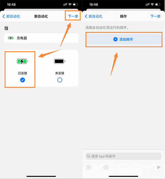往下滑到底部,选择「充电器」,勾选「已连接」,接着点击「下一步」,再点击「添加操作」。