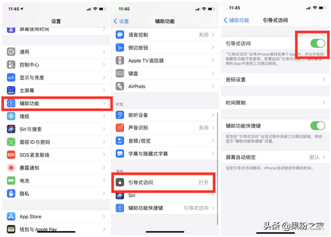 这个方法有点局限,主要就是将访问内容锁定在一个App里,在开启引导式访问后无法使用和打开其他App。假如手机借给别人看果粉之家文章,那么开启引导式访问后,别人就只能在微信这个App里活动。另外,还可以设定使用时间,当时间到了之后手机就会自动锁定在当前App界面,无法使用。
