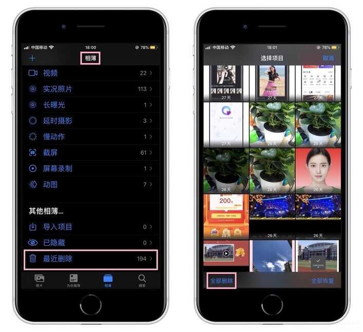 我们平时将相册里的照片删掉,你以为真的被删掉了吗?不妨点击底部的【相簿】,选择【最近删除】,这里面积累着大量照片,需要全部清空。