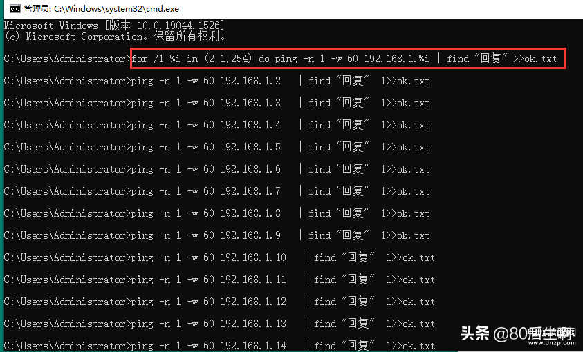 for /l %i in (2,1,254) do ping -n 1 -w 60 192.168.1.%i | find "回复" >>ok.txt