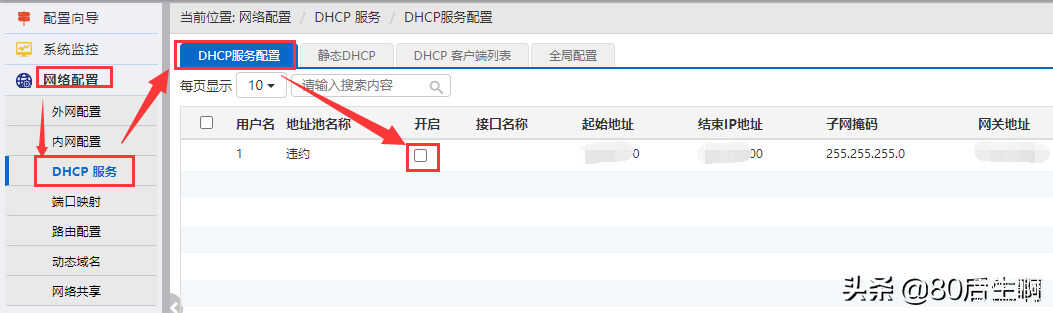然后找到下图的网络配置,DHCP服务,取消勾选从路由的DHCP,就可以关闭了。