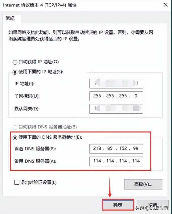 弹出的窗口,选择使用下面的DNS服务器地址,分别填入DNS服务器地址,