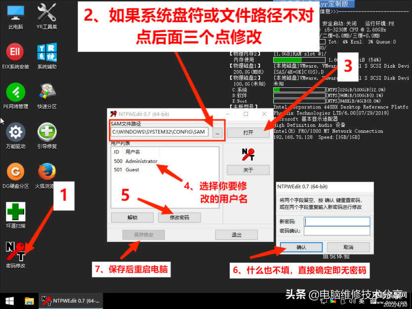 开机能过键盘快捷键调用启动菜单(调用启动菜单详解),选择优盘引导进入PE系统,用破解软件,将系统密码清空,再开机就不需要输入密码就可登录了!需要准备优盘,用其它电脑制作优盘启动盘,开机调用启动菜单,选择优盘引导进入PE系统。(制作优盘启动盘视频、图文详解)用优盘清理WIN7/WIN10/WIN11系统密码,方法相同!如图: