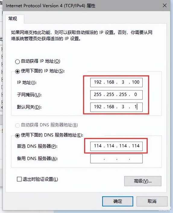 ④如果【选择使用下面的IP地址】,则需要手动输入IP地址,前提是需要知道具体的IP地址,在遇到QQ能上但网页打不开时,上面一栏可以选择【自动获得IP地址】,下面一栏选择【使用下面的DNS服务器地址】,并输入114.114.114.114(全国通用),设置完成后点击确定(注意:点击【确定】后,回到上一层界面还需要再点一次【确定】,否则更改不生效)。