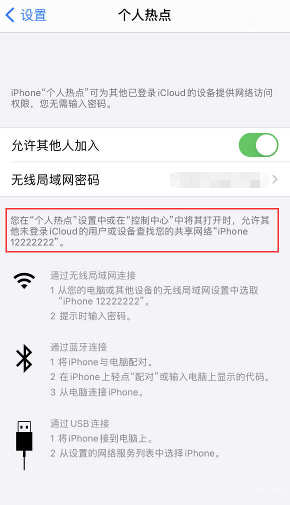 修改完毕进行保存之后,打开 iPhone 设置-个人热点,当您开启“允许其他人加入”开关之后,可以在下方查看到已经修改过的设备名称,也就是热点名称。
