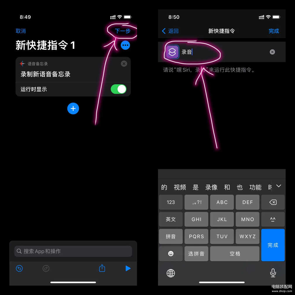 3.接着我们将会看到,新的快捷指令添加完成了,点击【下一步】,给这个指令输入一个名称,再点击【完成】。