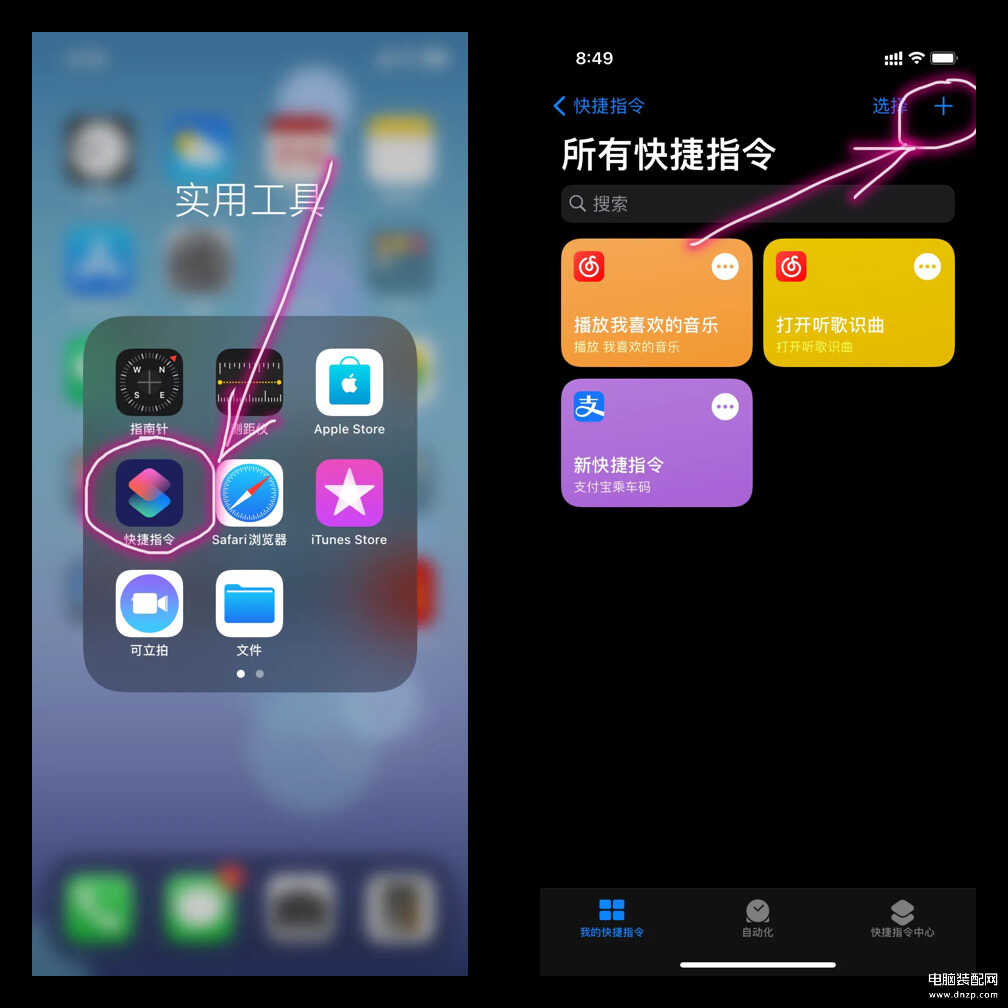 1.首先打开桌面上的快捷指令工具,如果你没有找到的话,可以呼叫Siri帮你打开,进入后点击右上角的“+”号。