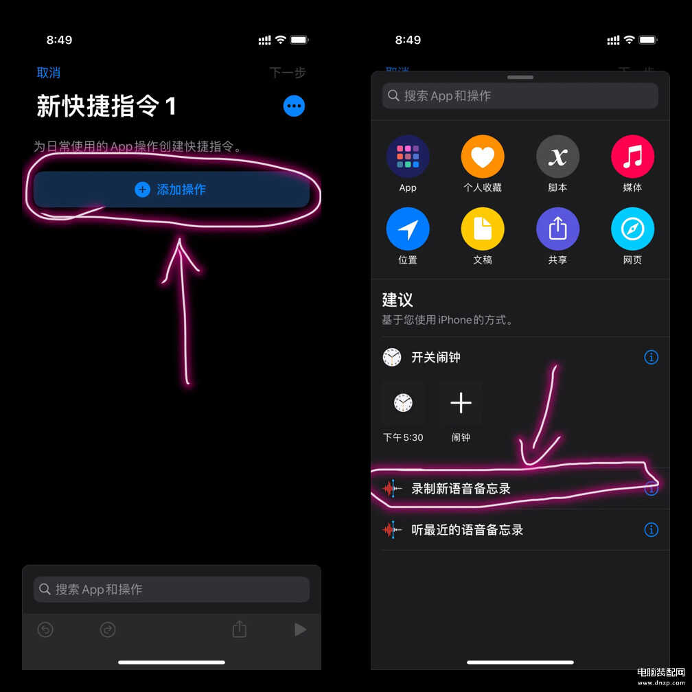 2.然后开始新建快捷指令,点击【添加操作】按钮,在下方会有一个【录制新语音备忘录】功能,点击选择它。