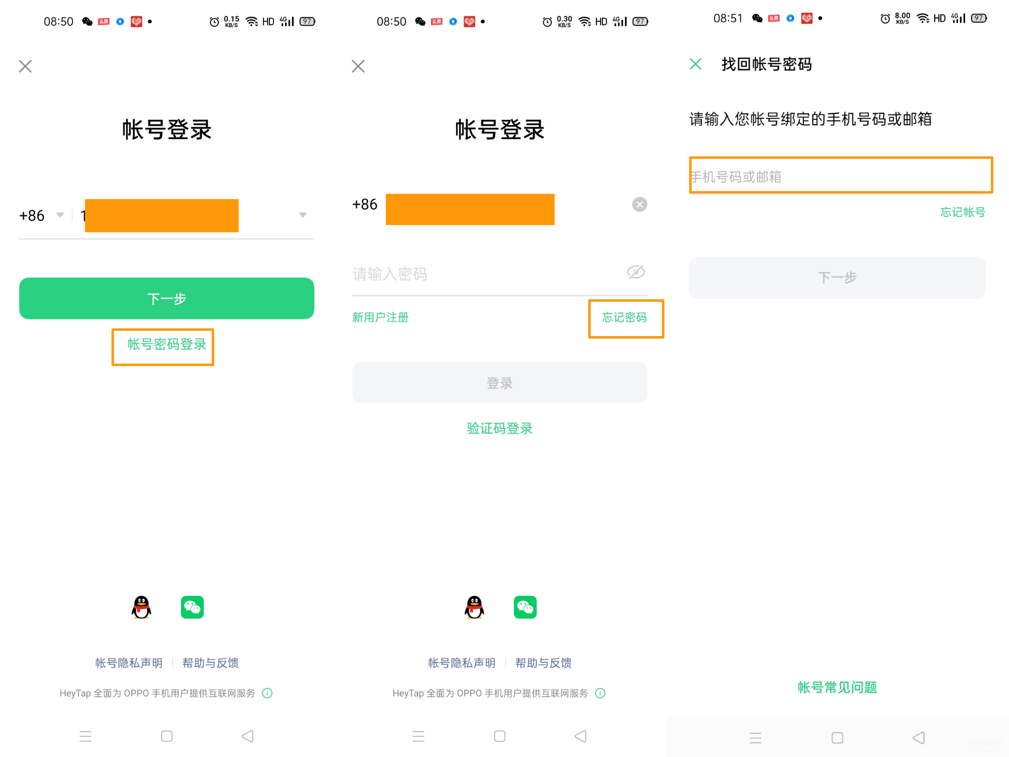 方法一、如果OPPO帐号绑定过手机或邮箱:
